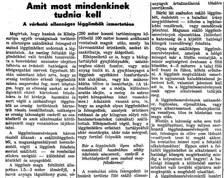 Megírtuk, hogy hazánk és Közép-Európa egyéb országainak területére ellenséges szándékkal felengedett szabad léggömböket sodornak a légáramlatok. Az esetleg feltalált léggömbökkel való további tennivalókra a honvédelmi miniszter idejében felhívta az érdekelt hatóságok és közigazgatási szervek figyelmét. Miután számítani lehet arra, hogy az ország területére érkező léggömbök száma szaporodni fog, mert lehetséges, hogy az ellenség azokat az eddigiektől eltérő kártokozó feladatokra is fel kívánja használni és mert végül a szóban forgó léggömbök az ország területének bármelyik részén leszállhatnak, szükséges az ország lakosságát ezekről az eszközökről és azok alkalmazási körülményeiről nagy vonalakban tájékoztatni.