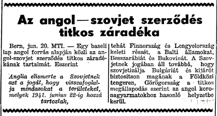 Bern, jún. 20. MTI. - Egy baseli lap angol forrás alapján közli az angol-szovjet szerződés titkos záradékának tartalmát. Eszerint Anglia elismerte a Szovjetnek azt a jogát, hogy visszafoglalja mindazokat a területeket, melyek 1941. június 22-ig hozzá tartoztak, tehát Finnország és Lengyelország keleti részét, a Balti államokat, Besszarábiát és Bukovinát. A Szovjetnek jogában áll továbbá, hogy szovjetizálja Bulgáriát és kijárót biztosítson magának a Földközi tengeren, Görögország a titkos megállapodás szerint az angol koronagyarmatokhoz hasonló helyzetbe kerül.