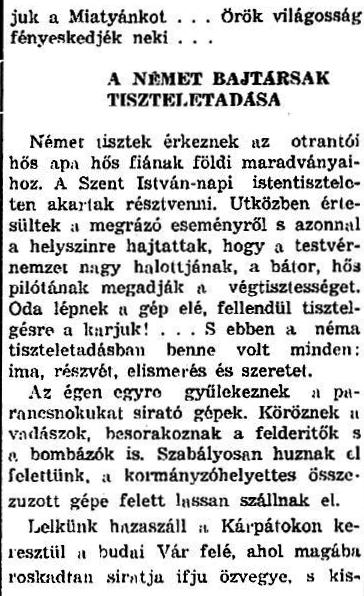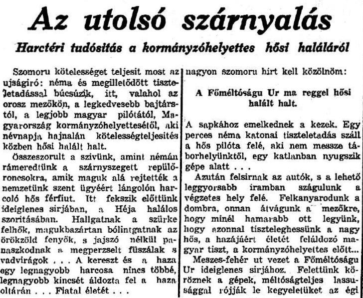Szomorú kötelességet teljesít most az újságíró: néma és megilletődött tiszteletadással búcsúzik, itt, valahol az orosz mezőkön, a legkedvesebb bajtárstól, a legjobb magyar pilótától, Magyarország kormányzóhelyettesétől, aki névnapja hajnalán kötelességteljesítés közben hősi halált halt.