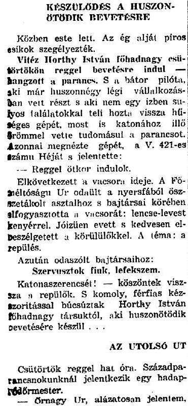 Vitéz Horthy István főhadnagy csütörtökön reggel bevetésre indul – hangzott a parancs. S a bátor pilóta, aki már huszonnégy légi vállalkozásban vett részt s aki nem egy ízben súlyos találatokkal teli hozta vissza hűséges gépét, most is katonához illő örömmel vette tudomásul a parancsot. Azonnal megnézte gépét, a V. 421-es számú Héját s jelentette: