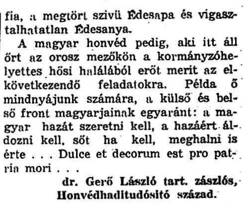 A magyar honvéd pedig, aki itt áll őrt az orosz mezőkön, a kormányzóhelyettes hősi halálából erőt merít az elkövetkezendő feladatokra. Példa ő mindnyájunk számára, a külső és belső front magyarjainak egyaránt: a magyar hazát szeretni kell, a hazáért áldozni kell, sőt ha kell, meghalni is érte... Dulce et decorum est pro patrin mori…