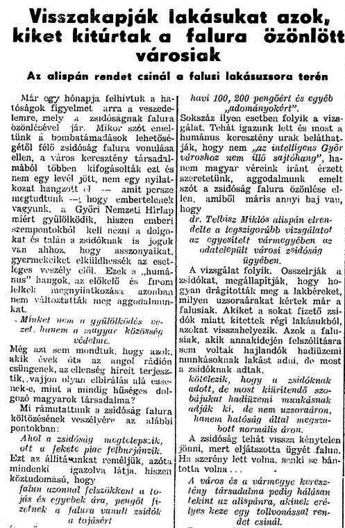 A zsidóság falura özönlésével felborult a jóviszony. A falusiakat elszédítette a pénz, a magas ajánlat, a beígért, vagy máris juttatott ruhanemű, ágynemű – mert a zsidóság ezzel is tud fizetni, bizonyítani tudjuk, hogy így van. Így azután nem egy helyen mondták fel a hat–tíz éve bérelt albérleti szobát a gyárba járó munkásnak, aki kénytelen volt pár szem baromfiállományát, kismalacát elkótyavetyélni és míg ő 20–30 pengőt fizetett a szobáért, bevonult helyette a zsidócsalád havi 100, 200 pengőért és egyéb „adományokért”. Sok száz ilyen esetben folyik a vizsgálat. Tehát igazunk lett és most a humánus keresztény urak beláthatják, hogy nem „az intelligens Győr városhoz nem illő sajtóhang”, hanem magyar véreink iránt érzett szeretetünk, aggodalmunk emelt szót a zsidóság falura özönlése ellen, amiből máris annyi baj van, hogy dr. Telbisz Miklós alispán elrendelte a legszigorúbb vizsgálatot az egyesített vármegyében az odatelepült városi zsidóság ügyében. A vizsgálat folyik. Összeírják a zsidókat, megállapítják, hogy hogyan drágították meg a lakbéreket, milyen uzsoraárakat kértek már a falusiak. Akiket a sokat fizető zsidók miatt kitettek régi lakásukból, azokat visszahelyezik. Azok a falusiak, akik annakidején felszólításra sem voltak hajlandók hadiüzemi munkásoknak lakást adni, de most a zsidóknak adtak, kötelezik, hogy a zsidóknak adott, de most kiürítendő szobájukat hadiüzemi munkásnak adják ki, de nem uzsoraáron, hanem hatóság áltál megszabott normális áron.