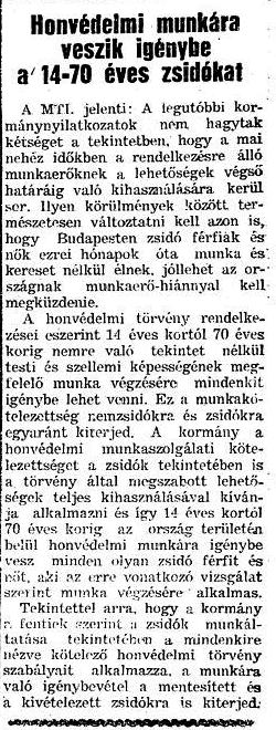 Az MTI. jelenti: A legutóbbi kormánynyilatkozatok nem hagytak kétséget a tekintetben, hogy a mai nehéz időkben a rendelkezésre álló munkaerőknek a lehetőségek végső határáig való kihasználására kerül sor. Ilyen körülmények között természetesen változtatni kell azon is, hogy Budapesten zsidó férfiak és nők ezrei hónapok óta munka és kereset nélkül élnek, jóllehet az országnak munkaerő-hiánnyal kell megküzdenie.