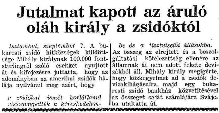 Isztambul, szeptember 7. A bukaresti zsidó hitközségek küldöttsége Mihály királynak 100.000 fontsterlingről szóló csekket nyújtott át, és kifejezésre juttatta, hogy az adományban az amerikai zsidók hálája nyilvánul meg azért, hogy a zsidókat ismét korlátlanul visszaengedték a kereskedelembe és a tisztviselői állásokba. Az összeg az elrejtett és a beszolgáltatási kötelezettség ellenére az államnak át nem adott fekete devizákból áll. Mihály király megígérte, hogy közkegyelmet ad a zsidók devizakihágásaira, majd egy bukaresti zsidó bankház közvetítésével az összeget saját számlájára Svájcba utaltatta át.