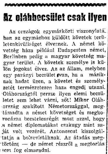 Az országok egymásközti viszonylatában az egymáshoz küldött követek területenkívüliséget élveznek. A német követség háza például Budapesten német, Berlinben pedig a magyar követség magyar területei. A követek személye is külön jogokat élvez. Az az állam, melyben egy parányi becsület van, ha a másiknak hadat üzen, a követet és személyzetét természetesen haza engedi utazni. Oláhországtól persze ilyen elemi becsületet sem lehet várni, sőt! Mikor Oláhország szakított Németországgal, megtámadta a német követséget és megkoronázta becstelenségét most azzal, hogy a német diplomatákat csakúgy, mint saját volt vezérét, Antonescut kiszolgáltatja a bolsevistáknak. Az átadás megtörtént – de német részről a megtorlás nem fog elmaradni.