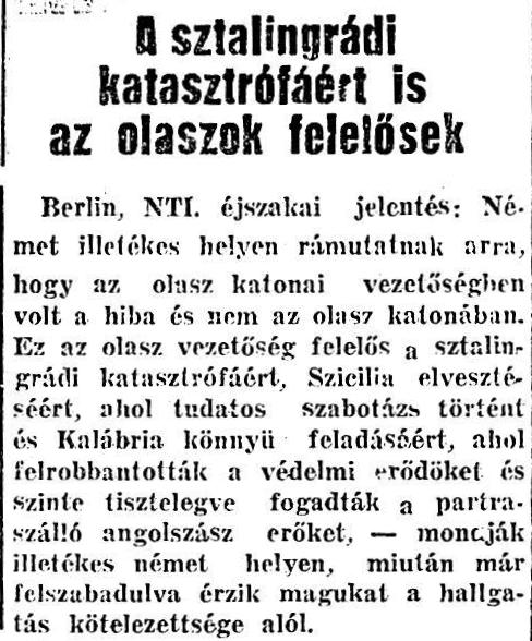 Berlin, NTI. éjszakai jelentés: Német illetékes helyen rámutatnak arra, hogy az olasz katonai vezetőségben volt a hiba és nem az olasz katonában. Ez az olasz vezetőség felelős a sztalingrádi katasztrófáért, Szicília elvesztésért, ahol tudatos szabotázs történt és Kalábria könnyű feladásáért, ahol felrobbantották a védelmi erődöket és szinte tisztelegve fogadták a partraszálló angolszász erőket, – mondják illetékes német helyen, miután már felszabadulva érzik magukat a hallgatás kötelezettsége alól.