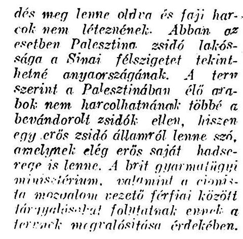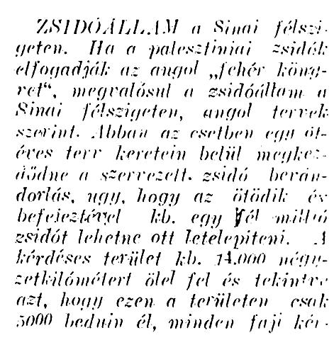 Zsidóállam a Sínai félszigeten. Ha a palesztinai zsidók elfogadják az angol „fehér könyvet”, megvalósul a zsidóállam a Sínai félszigeten, angol tervek szerint. Abban az esetben egy ötéves terv keretein belül megkezdődne a szervezett, zsidó bevándorlás, úgy, hogy az ötödik év befejeztével kb. félmillió zsidót lehetne ott letelepíteni. A kérdéses terület kb. 14.000 négyzetkilométert ölel fel és tekintve azt, hogy ezen a területen csak 5000 beduin él, minden faji kérdés meg lenne oldva és faji harcok nem léteznének. Abban az esetben Palesztina zsidó lakossága a Sínai félszigetet tekinthetné anyaországának. A terv szerint a Palesztinában élő arabok nem harcolhatnának többé a bevándorolt zsidók ellen, hiszen egy erős zsidó államról lenne szó, amelynek elég erős saját hadserege is lenne. A brit gyarmatügyi minisztérium, valamint a cionista mozgalom vezető férfiai között tárgyalásokat folytatnak ennek a tervnek megvalósítása érdekében.