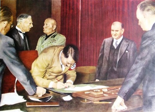 Pénteken hajnali két órakor jelenti a Magyar Távirati Iroda: Most vett müncheni híradás szerint Hitler, Mussolini, Chamberlain és Daladier éjjel fél egy órakor aláírták a megegyezést a szudétanémet vidék átengedésének feltételeiről és módozatairól. A négy államférfi tanácskozása még ezután is tovább folytatódott és éjjel fél kettő után ért véget.