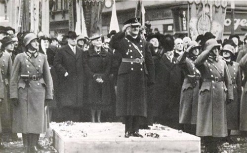 Budapest, nov. 10. MTI. A Magyar Revíziós Liga és a Magyar Frontharcos Szövetség csütörtökön déli 1 órakor az ereklyés országzászló előtt nagy ünnepséget rendezett lord Rothermere itt tartózkodása alkalmából. Ott volt a Revíziós Liga vezetősége, élén Herczeg Ferenccel, a Frontharcos Szövetség vezetősége Takách-Tolvay gróffal és az ereklyés országzászló bizottság elnöksége élén Urmánczy Nándorral. Kivonultak a hatalmas térre a frontharcosok díszszázadai, a leventék, az iskolai ifjúság és a gyárak, vállalatok munkásai, amelyeknek 20 ezres tömegével együtt a tömeg százezer főre emelkedett. Amikor lord Rothermere megjelent kísérőivel, a tömeg óriási éljenzésbe és ünneplésbe kezdett, lobogtatva tábláikat, amelyeken ez állt: „Lord Rothermere”, majd „Mindent vissza, mindent vissza!”