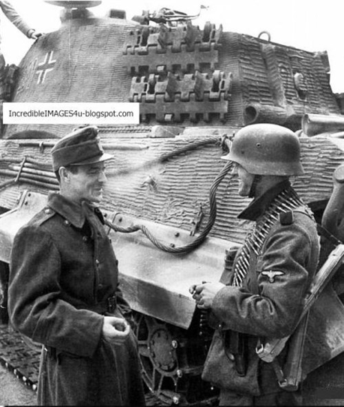 Magyar és SS-katona cigarettázik 1944 decemberében. Háttérben Tigris-2 harckocsi