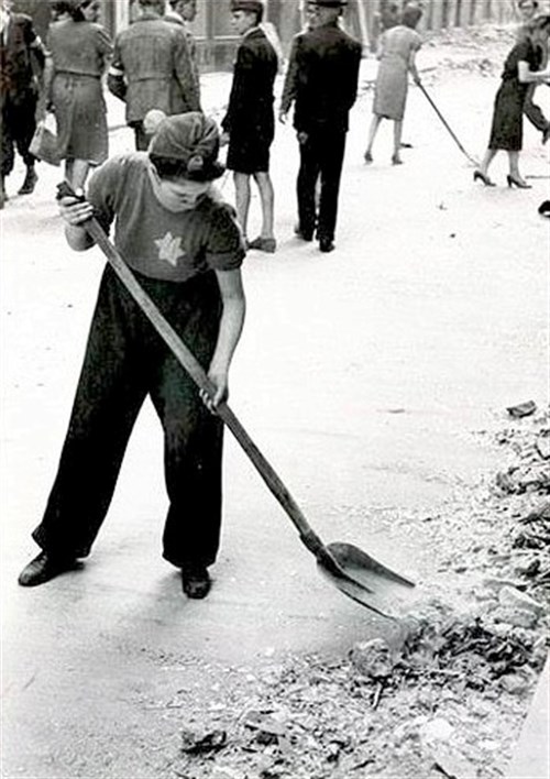 Sárgacsillagos nő romeltakarításon