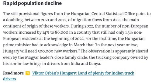 Gyors népességcsökkenés: a KSH szerint 2021 és 2022 között megduplázódott a migránsáradat Ázsiából, a bevándorló munkások fő származási kontinenséről. 2022 folyamán a nem európai munkások száma 14 százalékkal 86 ezerre nőtt egy olyan országban, ahol még csak 1,3 százalék a nem európaiak aránya. A miniszterelnöknek első ízben kellett elismernie 2022 márciusában, hogy "a következő egy-két évben Magyarországnak félmillió új munkavállalóra lesz szüksége". A megállapítást a jelek szerint még a magyar vezető közeli családi köre is osztja, mert a veje által birtokolt teherfuvarozási cég Indiából és Kenyából hoz gépkocsivezetőket
