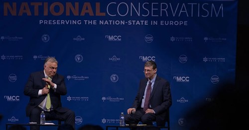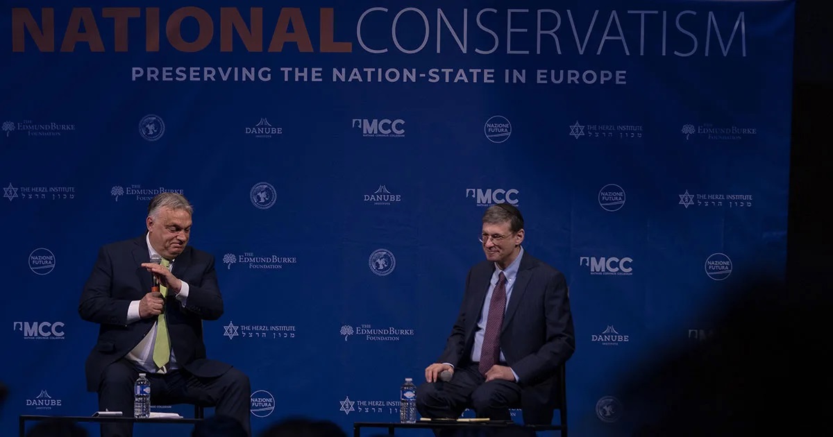 Orbán Viktor és Yoram Hazony a 2024-es „nemzeti konzervativizmusról” szóló konferencián Brüsszelben, Belgiumban (forrás: Omar Havana/Getty Images; dissentmagazine.org)