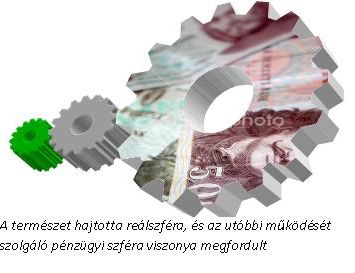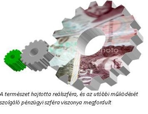 A világot úgy is szemlélhetjük, mint három fogaskerék, az első kicsi, a második kb. kétszer akkora, a harmadik legalább 100-szorosa az első méretének. Egymást hajtják. Az első a természeti rendszer a maga „szolgáltatásaival" (nyersanyagok, élelmiszerek, de ma már leginkább terület), a második az ún. reálgazdaság (ide tartozik az autóipar), a harmadik a pénzügyi szféra, beleértve sok mindent az árutőzsdéktől kezdve a spekulációs piacokig. Az utóbbiban sajnos legalább 50-szer annyi pénz forog, mint a reálgazdaságban, de ez a bűvös pénz (vicces az angol kifejezés: funny-money, az összeesküvéselmélet-hívők szótárában pl. karvalytőke) szeretne valódi pénzzé válni, mondjuk ingatlanban, termelésben, de legalább egy luxusjachtban vagy arany nyakláncban. Ez pörgeti a reálgazdaságot, s nem csak a szép hajók és ékszerek iránti feltétlen vágyódásunk. Minden gazdasági szereplő, amikor hitelt vesz fel, hozzájárul az újabb bűvpénz-bővüléshez (ahogy ezt Goethe kiválóan leírta a Faust 2. kötetében), de ami még nagyobb baj, tovább gyorsítja a reálgazdaság pörgését. Az optimálisnál nagyobb fordulatszámon pörgő gazdaság persze többet kíván a természeti rendszertől is, amit az - minden technológiai csoda ellenére is - egyszerűen nem bír. Az ökolábnyomunk, azaz a használható termőterületben kifejezett fogyasztásunk legalább 40%-kal nagyobb a lehetségesnél 2008-ban, de ez nagyon visszafogott számítás. Visszatértünk a 20 éves biztosíték 20 millió éves áramkör-újrahuzalozás hasonlathoz.