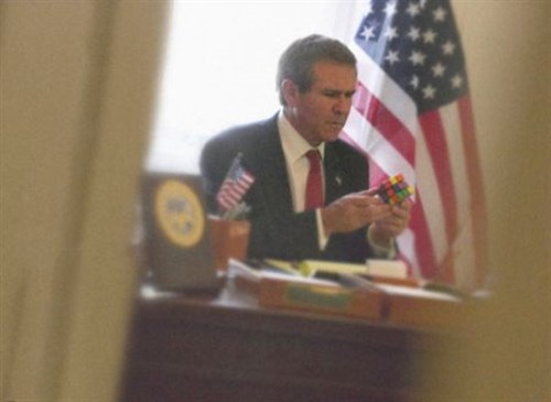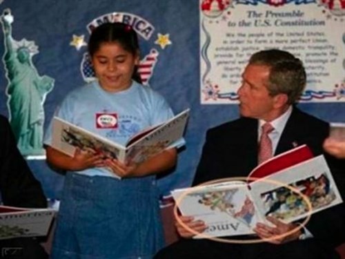 2002: Geourge W. Bush-ból nem ritkán próbáltak hülyét csinálni, a kép eredetijén nem tartja fejjel lefelé a könyvet.