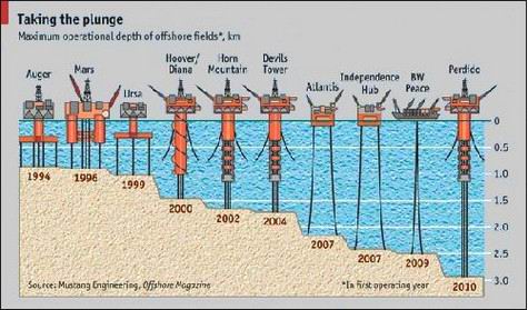 Az alábbi ábrán pedig a mélység fejlődése látszik, ami nagyon felgyorsult az árak növekedésével (Ennek ellenére a mélyvízi olaj önmagában közel sem oldja meg a világ olajproblémáit, de jó példája a technika fejlődésében és az olajkutatásokban rejlő lehetőségeknek):