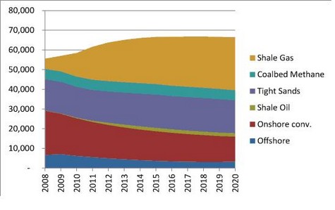 A legtöbb ember által egyáltalán nem ismert tény, hogy Észak-Amerikában csökkenő import mellett az elmúlt 4 évben több mint 50%-ot esett a földgáz ára. Ez a nem hagyományos gáztermelés, elsősorban a palagáz- (shale-gas) termelés robbanásszerű elterjedésének köszönhető, ami a már hosszabb ideje fejlesztett homokkőgáz (thightgas-sands) és szénágyi metán (coalbed-methane) készletekkel együtt előzetes becslések szerint meg három-négyszerezték a bolygó gázkészleteit, ráadásul a korábbinál sokkal kedvezőbb földrajzi eloszlásban (az észak-amerikai gáztermelés megoszlása típúsonként. Látszik, hogy a palagáztermelés robbanásszerűen terjed a csökkenő árak ellenére):