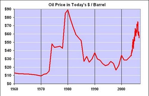 Az alábbi képen pedig az olajár összeroppanása látható a '80-as években, ami annak a következménye volt, hogy a magas árak hatására olyan mértékben kezdtek felfejlődni az OPEC-en kívüli termelési kapacitások, hogy az OPEC eladásai a töredékére estek vissza, és néhány éven belül lenullázódtak volna, hogyha nem csökkentik radikálisan az árakat: