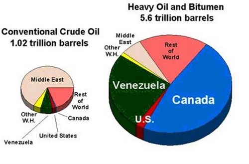 Ami hosszabb távon erőteljesen alakítja a világ olajkitermelését, az alább látható. A jelenleg hagyományosnak (bal kör) nevezett olajkitermelési módokkal tartalékoknak minősített olajmennyiség aránylik a főleg olajhomok formájában kötött nehézolajokhoz (jobb kör) a képen. Hiába fogy az olaj, 40 évvel ezelőtt 30 évre való, 10 éve 40 évre való, most pedig 50 évre való készlet van hátra. Jelenleg a világ készletei leginkább az olajhomok kitermelési technológiák elterjedésével növekednek, így Kanada és Venezuela az elmúlt 5 évben 15 évvel kitolta a világ olajkészleteit, és potenciáljuk ennek akár a 5-10 szerese is lehet a kitermelési technológia fejlődésével.