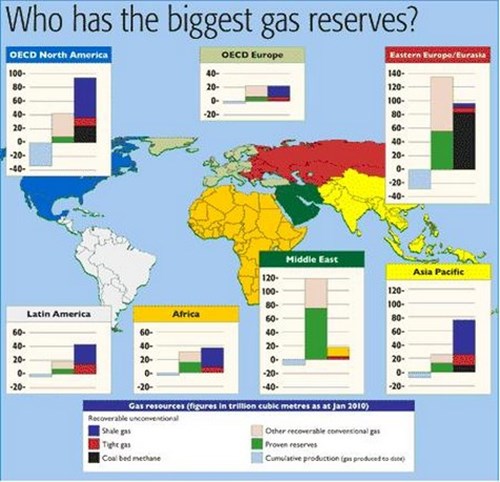 Az alábbi képen értelmezhető, hogy a gázipari forradalom hogyan változtatta meg a készletek jelentette erőviszonyokat. A legnagyobb jelentőségű növekedés Észak-Amerikában és Ázsiában következett be. Az előbbi miatt a cseppfolyós földgázszállítmányok Afrikából és a Közel-Keletről átirányulhatnak Európába, fékezve az árakat, sőt már felmerült, hogy az USA exportáljon Európába. Az utóbbi révén pedig a világ legnagyobb palagázkészletével rendelkező Kínában épülhet ki nagy termelés, amivel az oroszok nem tudják majd bizonyos ár fölött elpasszolni a készleteiket oda. Ezek a tények így már önmagukban jelentősen javítják Európa alkupozícióját, nem beszélve a kontinens saját palagáz- és homokkőgázkészleteiről, ami akár Európa 40-50évi fogyasztására elegendők lehetnek, és a Gazprom rémálmait képezik mostanában