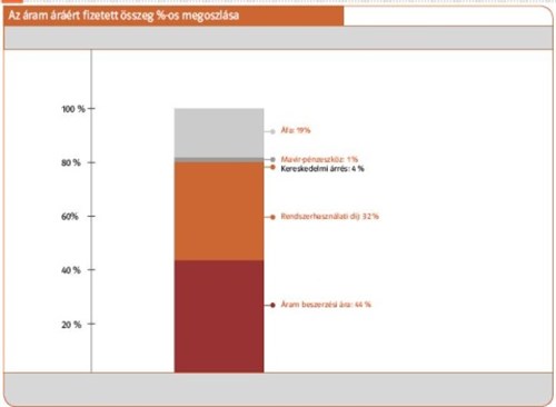 Alább a hálózati áram árának lebontása az E-ON-tól. A rendszerhasználati díj akkor is az áram árának közel felét kitenné, ha nem lenne adó rajta.