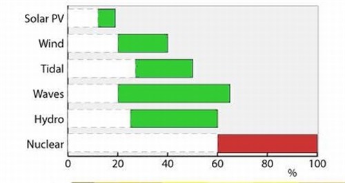 A kapacitásfaktor azt jelzi, hogy a beépített kapacitás hány százaléka az effektív, rendelkezésre álló kapacitás. Ez pedig szél- és napenergia esetében elég gyatra. Míg a szénerőműveknél a karbantartások révén a kapacitás faktor 85-90% közötti, az atomerőműveknél 90% fölötti, addig ez a szélerőműveknél 25-50% közötti (helyszínfüggő az olcsóbb szárazföldi erőműveknél alacsonyabb, a tengerieknél magasabb), a napelemeknél pedig helyszíntől függően 10-20%.