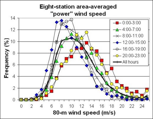 Egy tipikus éves szélsebességeloszlás napszakra lebontva: